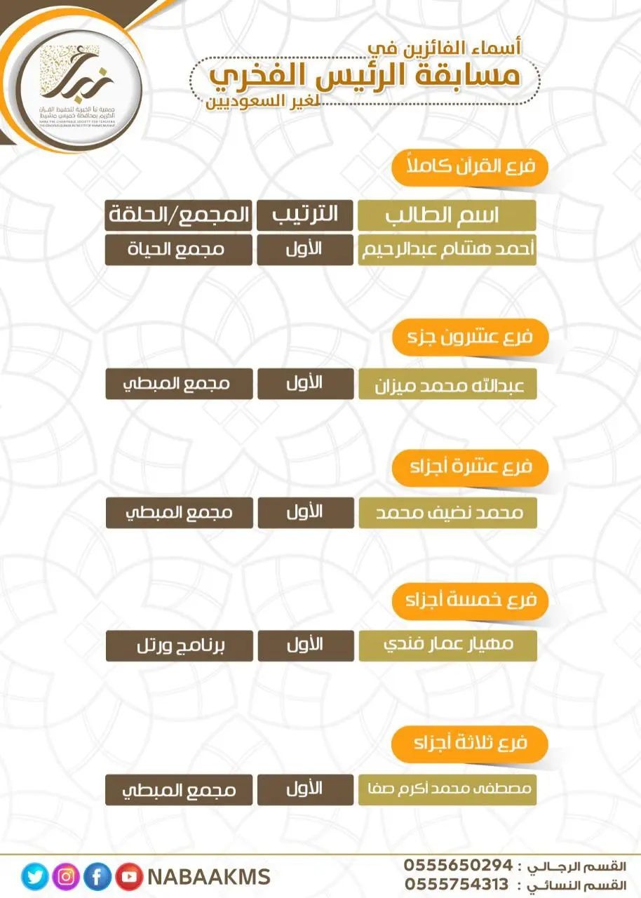 هنأت جمعية نبأ الخيرية لتحفيظ القرآن بخميس مشيط الفائزين بمسابقاتها السنوية لهذا العام ١٤٤٣.