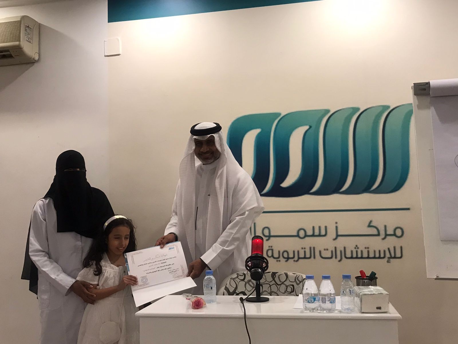 كرم مدير مركز سمو الفكر للإرشاد الأسري  الدكتور سامي الأنصاري مع الأخصائية  غادة شوعي  الطفلة حلا محمد الحربي وذلك نظير ماقدمته  من إنجاز باهر ومتميز رغم عن الصعاب التي واجهتها  إلا أنها أثبتت جدارتها بإرادتها القوية في إكمال مسيرتها في العلم وتحقيق هدفها وتطوير نفسها وفكرها وبارك لها الدكتور سامي هذا الإنجاز والتميز ودعاها لبذل المزيد للحصول لأعلى المراتب .