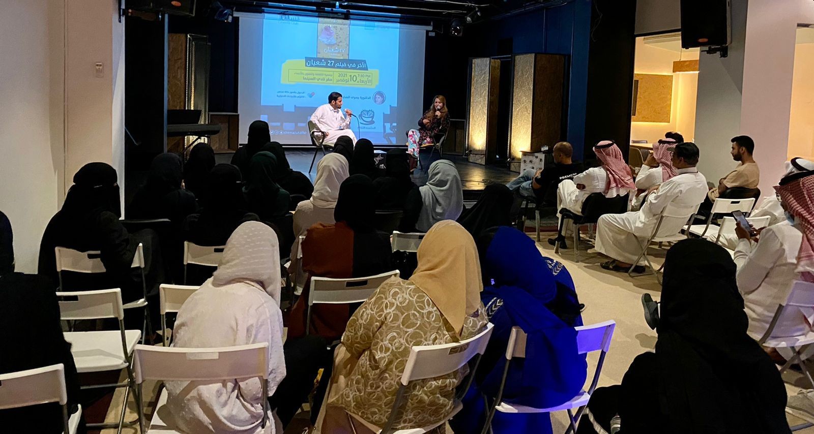 استضاف المقهى الثقافي بجمعية الثقافة والفنون بالأحساء الدكتورة يسرى الهذيلي في أمسية ثقافية سينمائية  بعنوان "الآخر في فيلم 27 شعبان"  في قاعة عبدالرحمن الحمد مقر نادي السينما.