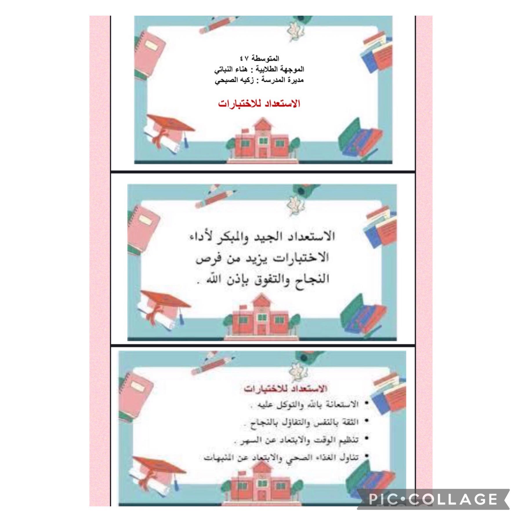 من جانبها أقامت مديرة المتوسطة السابعة والأربعون زكية الصبحي برنامجاً للتهيئة والاستعداد للاختبارات الحضورية ابتداءً بتقديم الوصايا والنصائح للطالبات الخاصة بالتخطيط الاستذكاري في فترة ما قبل الاختبارات بالإضافة إلى تهيئة الفصول المدرسية، وتوفير البيئة المناسبة لاستقبال الطالبات مع اتخاذ الإجراءات الاحترازية بالحفاظ على التباعد وتوفير المعقمات والكمامات، هذا و حرصت الصبحي على إرسال صورة من لجان الاختبارات لأولياء الأمور من أجل الاطلاع عليها وسهولة دخول الطالبة للقاعة بدون تأخير أو انتظار.