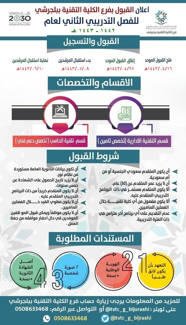 يبدأ فرع الكلية التقنية ببلجرشي، اليوم الأحد الموافق ٤/١٦ /١٤٤٣ ه- في استقبال طلبات المتقدمين إلكترونياً للقبول للفصل التدريبي الثاني للعام التدريبي ١٤٤٢-١٤٤٣-ه لبرنامج الدبلوم الصباحي ، وذلك عبر الموقع الإلكتروني للمؤسسة العامة للتدريب التقني والمهني www.tvtc.gov.sa؛ من خلال رابط القبول الموحد: https://ugate.tvtc.gov.sa/AFrontGate/.