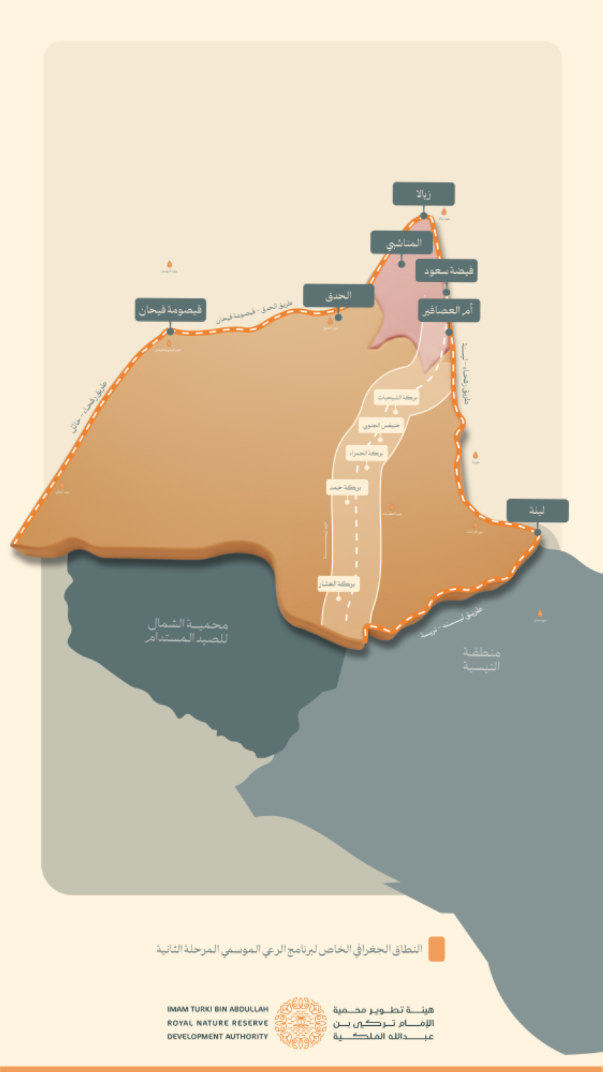 ويأتي هذا الإطلاق ليكون امتدادًا للدعم الكبير الذي يوليه صاحب السمو الملكي الأمير محمد بن سلمان بن عبد العزيز آل سعود، ولي العهد رئيس مجلس الوزراء رئيس مجلس المحميات الملكية -حفظه الله- لتيسير احتياجات ملاك الإبل ودعم المجتمعات المحلية، وذلك بعد ما شهدته المحمية خلال الأعوام الماضية من تحسّن في الغطاء النباتي بفضل برامج الحماية والتنظيم، وبمتابعة وإشراف مباشر من صاحب السمو الملكي الأمير تركي بن محمد بن فهد بن عبدالعزيز آل سعود وزير الدولة عضو مجلس الوزراء رئيس مجلس إدارة الهيئة.
