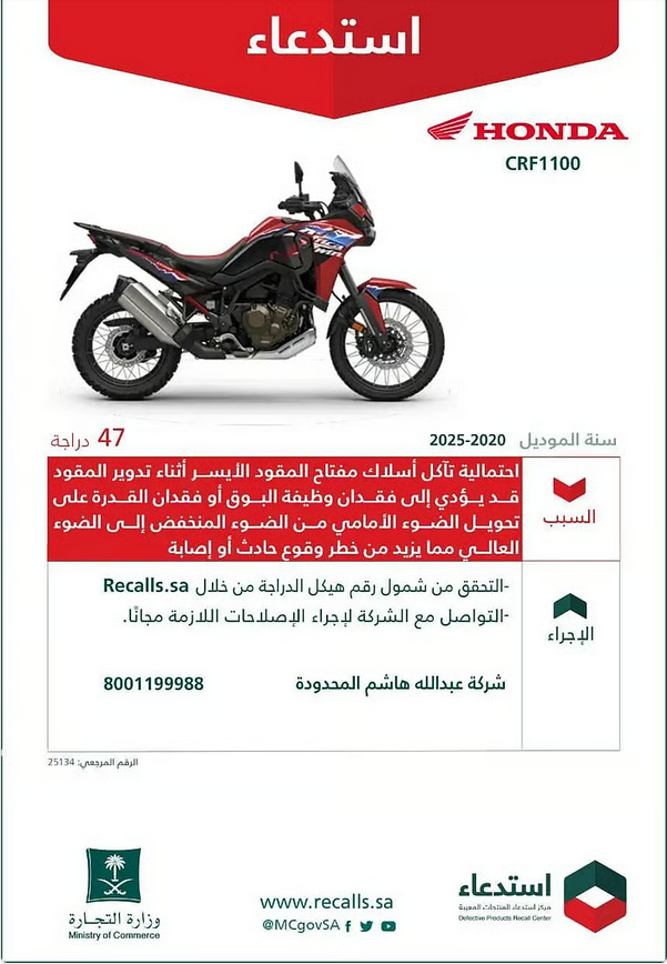 أعلنت وزارة التجارة استدعاء 47 دراجة نارية من نوع (هوندا - CRF1100) من موديلات الأعوام 2020 إلى 2025؛ لاحتمالية تآكل أسلاك مفتاح المقود الأيسر أثناء تدوير المقود، مما قد يؤدي إلى فقدان وظيفة جهاز التنبيه الصوتي (البوري)، أو فقدان القدرة على تحويل الضوء الأمامي من الضوء المنخفض إلى العالي، وهو ما يزيد من خطر وقوع حادث أو إصابة.