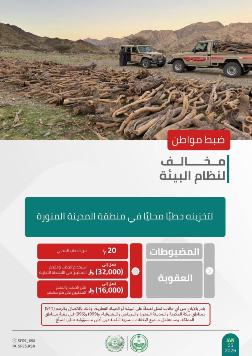 ضبطت القوات الخاصة للأمن البيئي مواطنًا مخالفًا لنظام البيئة، بحوزته (20) مترًا مكعبًا من الحطب المحلي في منطقة المدينة المنورة، وتم تطبيق الإجراءات النظامية بحقه، وتسليم الكميات المضبوطة للجهات المختصة.