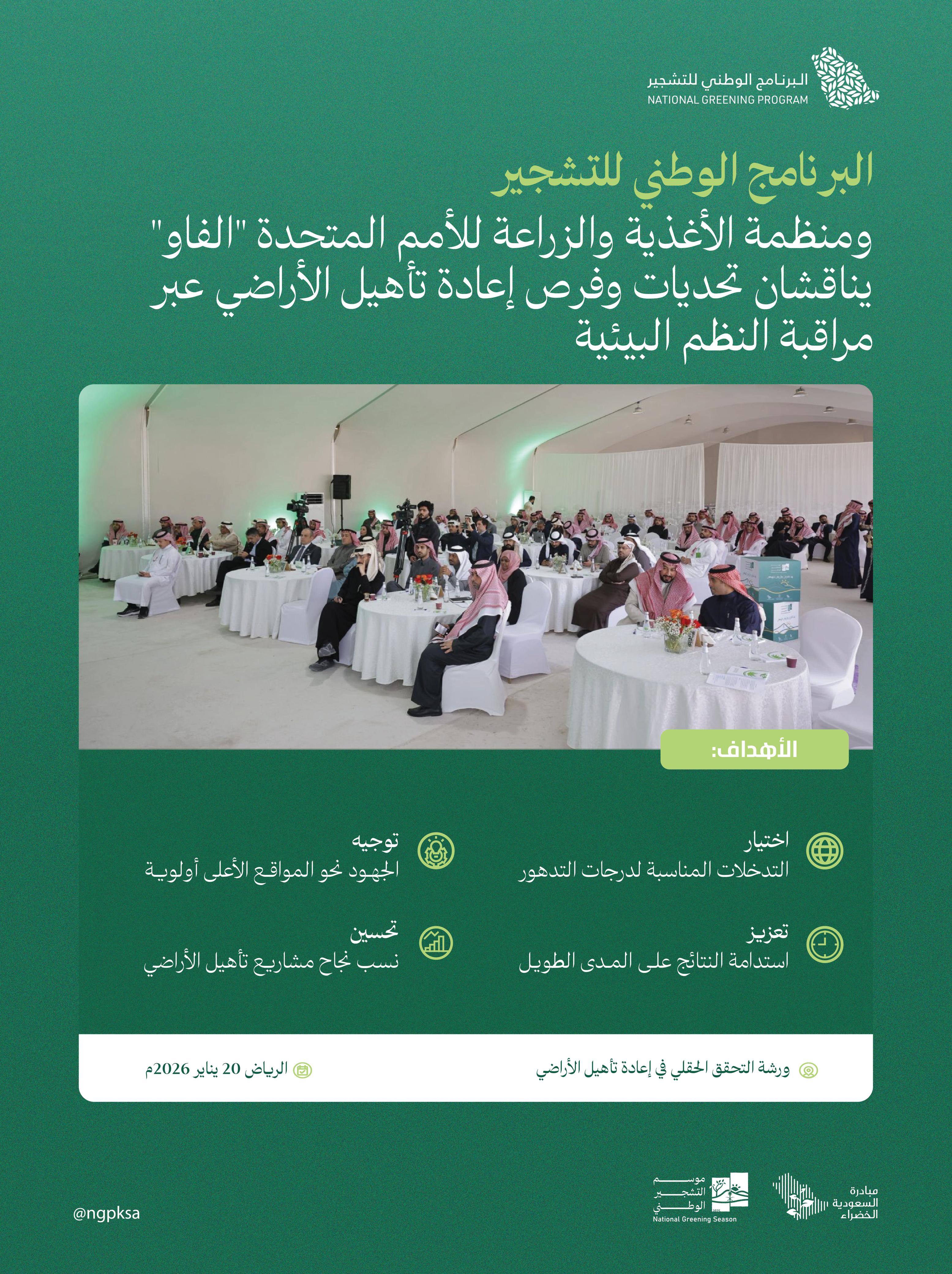 جاء ذلك خلال الورشة الوطنية حول التحقق الميداني في إعادة تأهيل الأراضي، التي نظمها البرنامج بالتعاون مع منظمة الأغذية والزراعة للأمم المتحدة "الفاو"، بمشاركة عدد من المختصين والجهات ذات العلاقة؛ بهدف مناقشة التحديات واستعراض الفرص الإستراتيجية لإعادة تأهيل الأراضي في المملكة.