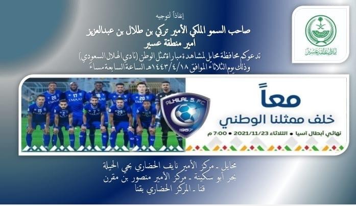 بحضور محافظ محايل علي بن إبراهيم الفلقي ندعوكم لمشاهدة المباراة النهائية لممثل الوطن نادي الهلال الساعة السابعة من مساء بعد غداً الثلاثاء  في مركز الأمير نايف الحضاري بمحايل  وكذلك أيضاً سوف تنقل المباراة في المركز الحضاري بمركز قنا ومركز الأمير منصور بن مقرن بمركز بحر أبوسكينة لدعم ممثل الوطن في هذه المناسبة الوطنية.