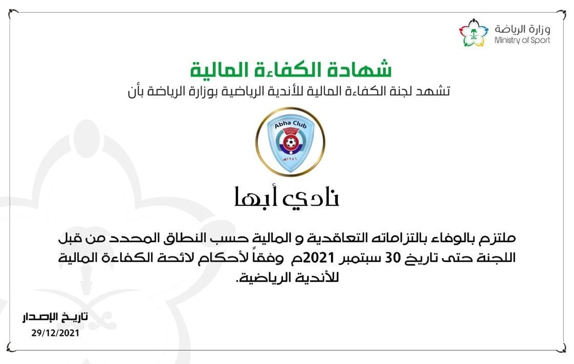 حصل نادي أبها اليوم الخميس على شهادة الكفاءة المالية من وزارة الرياضة، وذلك بعد سداده لكافة الالتزامات المالية التي كانت عليه.