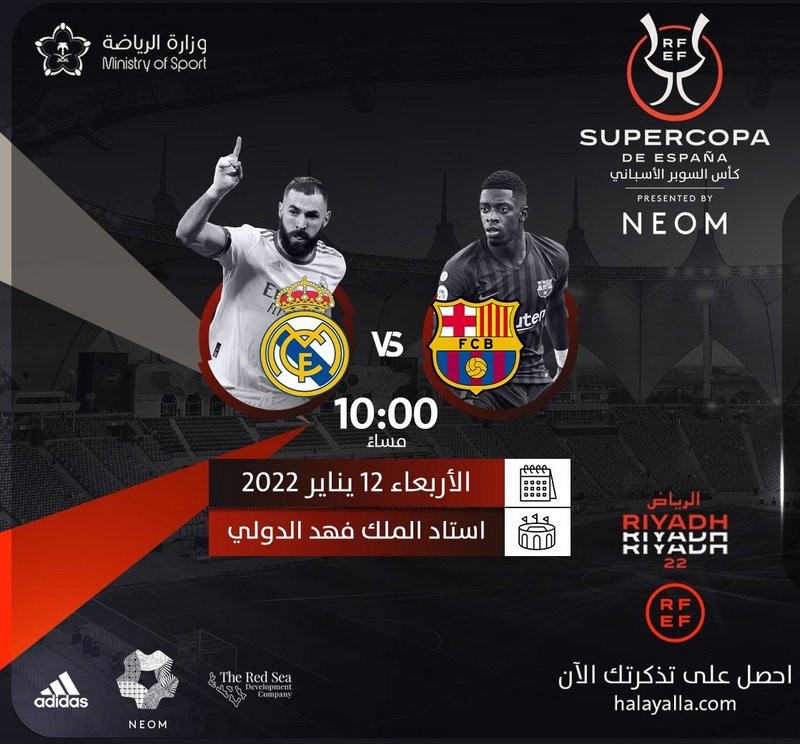 كشفت وزارة الرياضة، اليوم الثلاثاء، عن أسعار تذاكر الكلاسيكو الإسباني بين ريال مدريد وبرشلونة الأربعاء 12 يناير الجاري، في نصف نهائي السوبر الإسباني الذي يحتضنه ملعب الملك فهد الدولي "الدرة" بالرياض.