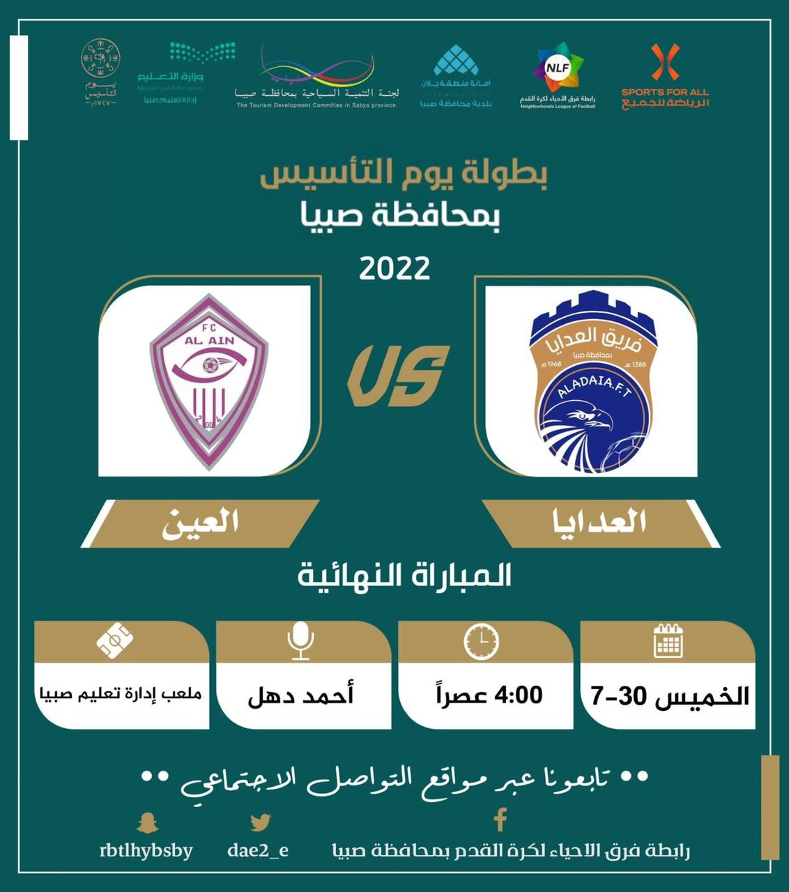 ومن المقرر أن تنطلق المباراة النهائية لـ"بطولة التأسيس" في تمام الرابعة عصرًا ، وستجمع فريقي (العين- العدايا)  بحضور ورعاية وكيل محافظة صبيا الدكتور إبراهيم عتودي ، حيث تأتي هذه الرعاية والحضور لدعم الرياضيين بالمنطقة عامة وبمحافظة صبيا خاصة بالإضافة لبعض الضيوف الذين تمت دعوتهم من قبل مدير مكتب رابطة محافظة صبيا لفرق الأحياء الأستاذ عيسى غزاوي.