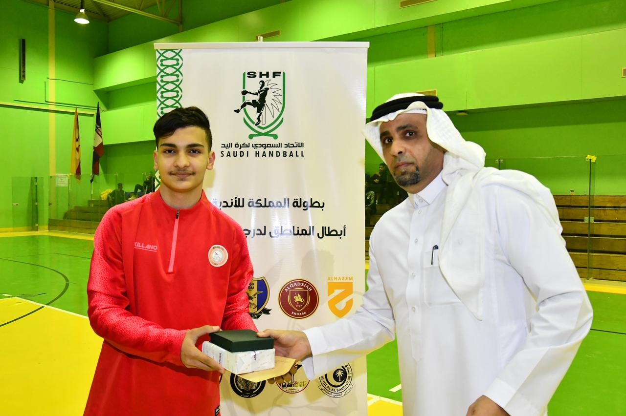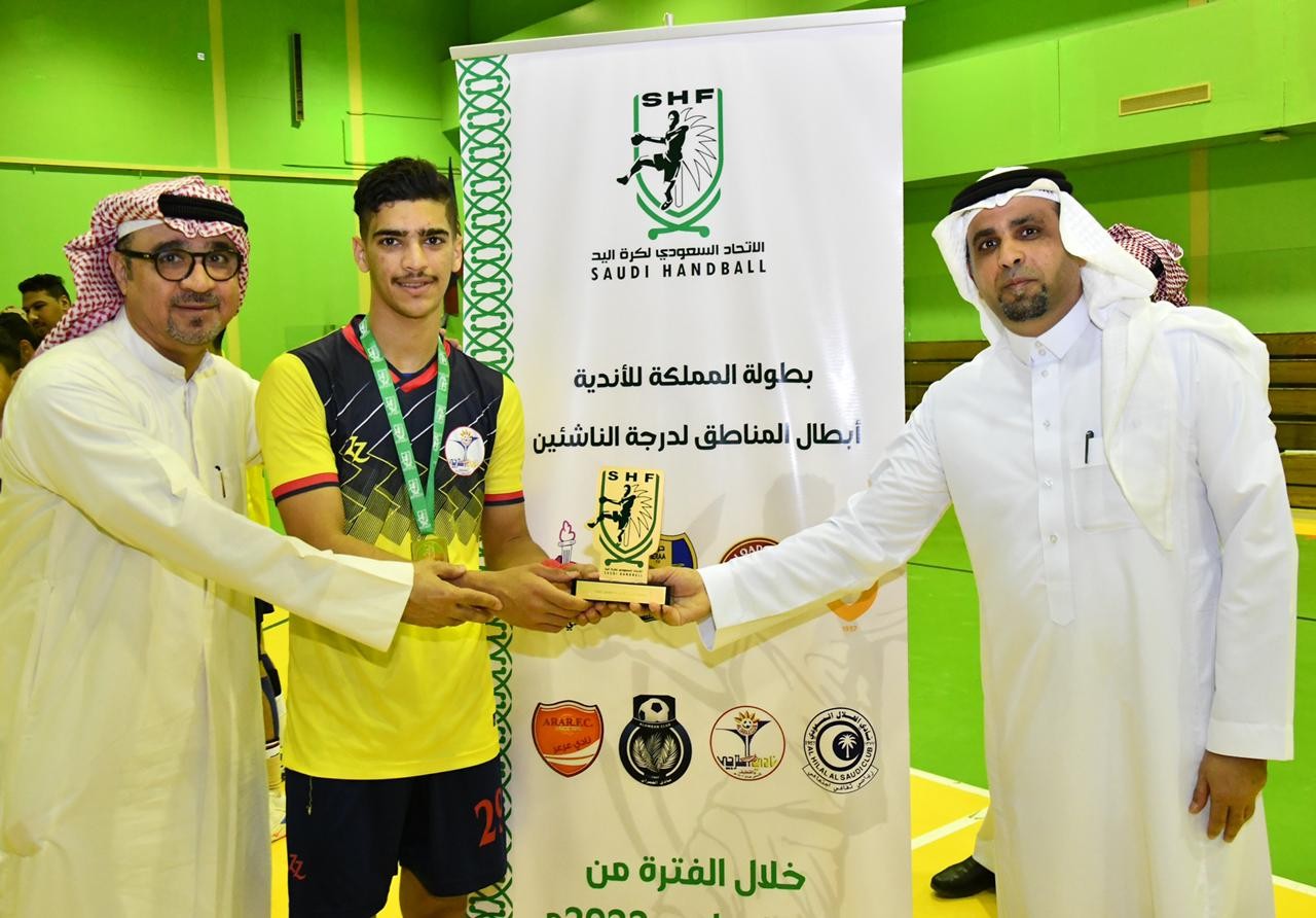 توّج عضو مجلس إدارة الاتحاد السعودي لكرة اليد الأستاذ فاخر غاشي فريق الترجي بدرع بطولة المملكة للأندية أبطال المناطق لدرجة الناشئين، عقب فوزه اليوم السبت في المباراة النهائية على فريق العمران بنتيجة (28-20) فيما حل العمران وصيفاً مرافقاً الترجي للدوري الممتاز للناشئين، في ختام منافسات البطولة التي احتضنتها صالة نادي الحزم بالرس على مدى خمسة أيام بمشاركة 8 فرق.وتمكن القادسية من التغلب على فريق الحزم بنتيجة (30-24) في مباراة تحديد المركزين الثالث والرابع، ليحل القادسية ثالثاً، والحزم رابعاً. وفي ختام المباريات، تم تتويج الأندية الفائزة بالمراكز الثلاثة الأولى، كما تم تكريم لاعب فريق الحزم مؤيد البيض بجائزة أفضل لاعب في البطولة، وحصل حارس فريق عرعر أسامة العنزي على جائزة أفضل حارس بالبطولة.