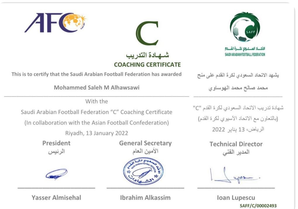 عبر المدرب الوطني مدير القناة الرياضية الاولي سابقاً الكابتن محمد الهوساوي عن سعادته بحصوله على شهادة C التدريبية من الاتحاد السعودي لكرة القدم ، وقال الحمدلله دائما وابدا حيث حصلت على الشهادة بعد حضوره لدورة المدربين التى نظمها الاتحاد السعودي لكرة القدم بالتعاون مع الاتحاد الاسيوي لابداء مشوار جديد من الكفاح المشروع لكل شخص فعندما يهبك الله الكثير من الامكانيات عليك بتسخيرها لخدمة الناس ، واضاف سانطلق قريبا من خلال احد الانديه لاجد النجاح مجددا في ميدان جديد .شكرا من القلب لكل من هنئني بالحصول علي شهادة c التدريبيه لاعدمتكم حفظكم الله كنزي الحقيقي في هذه الحياة احبكم جميعا في الله