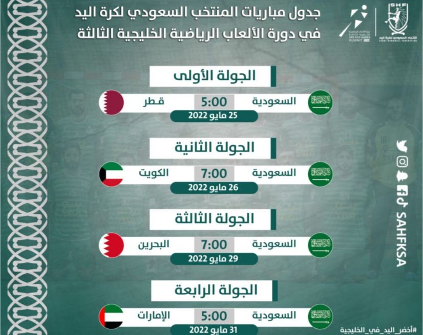 قررت لجنة المنتخبات والتدريب بالاتحاد السعودي لكرة اليد، إقامة معسكر داخلي للمنتخب السعودي الأول خلال الفترة من 15 حتى 22 مايو القادم، فيما ستغادر بعثة الأخضر يوم 23 مايو إلى دولة الكويت استعداداً للمشاركة في دورة الألعاب الخليجية الثالثة والمقرر اقامتها في الكويت خلال الفترة من 24-30 مايو 2022م.