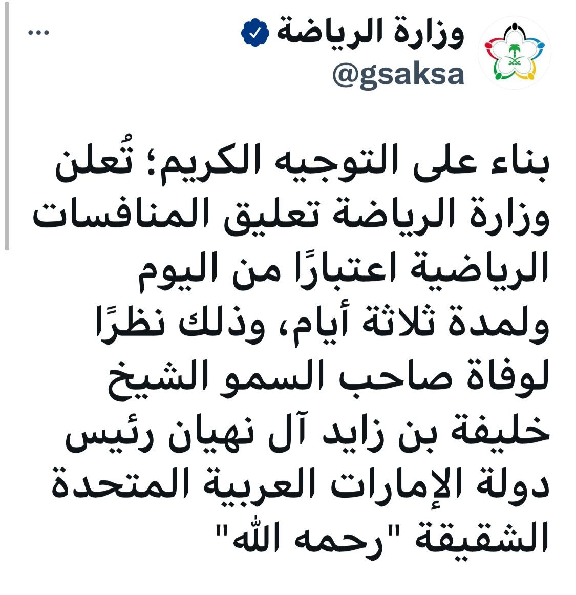 (بناء على التوجيه الكريم؛ تُعلن وزارة الرياضة تعليق المنافسات الرياضية اعتبارًا من اليوم ولمدة ثلاثة أيام، وذلك نظرًا لوفاة صاحب السمو الشيخ خليفة بن زايد آل نهيان رئيس دولة الإمارات العربية المتحدة الشقيقة "رحمه الله"