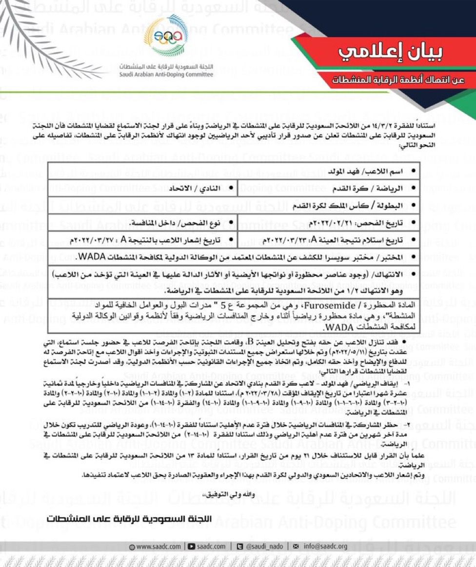 أعلنت لجنة الرقابة على المنشطات اليوم عبر حسابها الرسمي إيقاف لاعب الإتحاد فهد المولد من المشاركات الداخلية والخارجية لمدة عام ونصف ، حيث أن الإيقاف جاء بسبب ظهور عينة إيجابية في التحليل الذي أجرته اللجنة على اللاعب في بطولة كأس الملك ، كما وضحت اللجنة في بيانها بأن للاعب حق الإستئناف على القرار خلال ٢١ يوم من تاريخ القرار ، وبات من المؤكد غياب اللاعب عن كأس العالم للمنتخبات وكأس آسيا القادم .