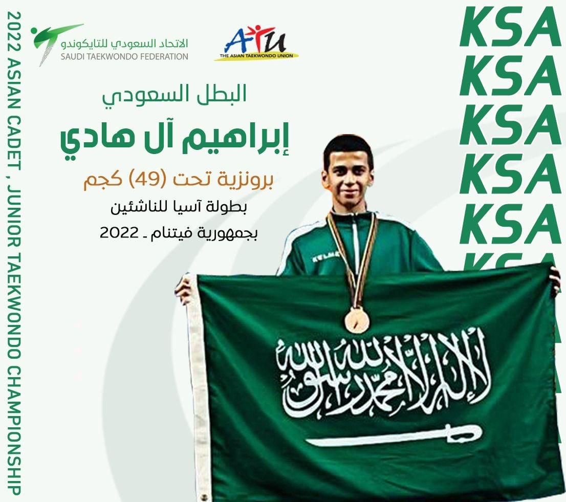 حقق لاعب المنتخب السعودي ونادي وج  في لعبة ⁧‫#التايكوندو‬⁩ "إبراهيم آل هادي " الميدالية البرونزية تحت ( 49 ) كجم في بطولة آسيا للناشئين بجمهورية فيتنام - 2022  ، ويعد إبراهيم احد النجوم البارزة في صفوف نادي وج ومن الأسماء الواعدة التي يؤمل عليها النادي في خدمة اللعبة وتمثيل المنتخبات الوطنية.
