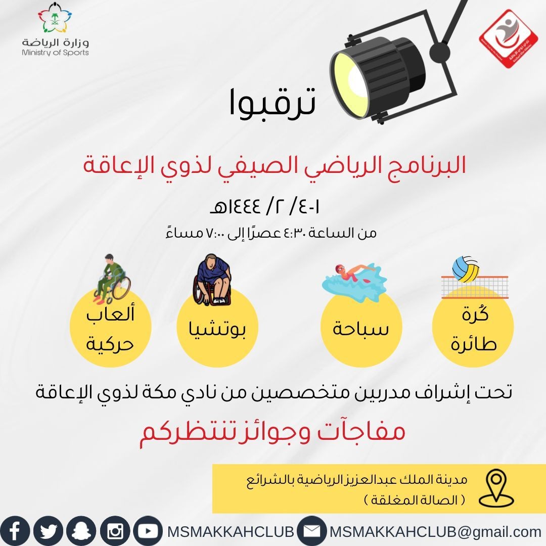 يطلق نادي مكة لذوي الإعاقة برنامجه الرياضي الصيفي مساء اليوم وذلك ضمن أنشطته الصيفية لاستثمار أوقات ذوي الإعاقة بما يعود عليهم بالنفع والفائدة .