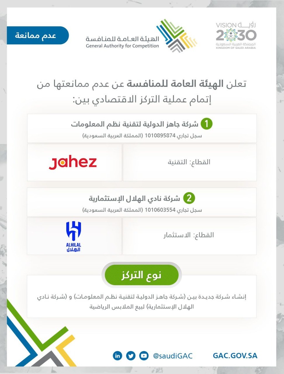 أعلنت الهيئة العامة للمنافسة عبر بيان رسمي اليوم عدم ممانعتها لعملية إنشاء شركة جديدة بين (شركة جاهز الدولية لتقنية المعلومات) و (شركة نادي الهلال الإستثمارية) لبيع الملابس الرياضية. وتعد عمليات المشاريع المشتركة بين الأطراف موجبة للإبلاغ وفقاً لنظام المنافسة ولائحته التنفيذية.