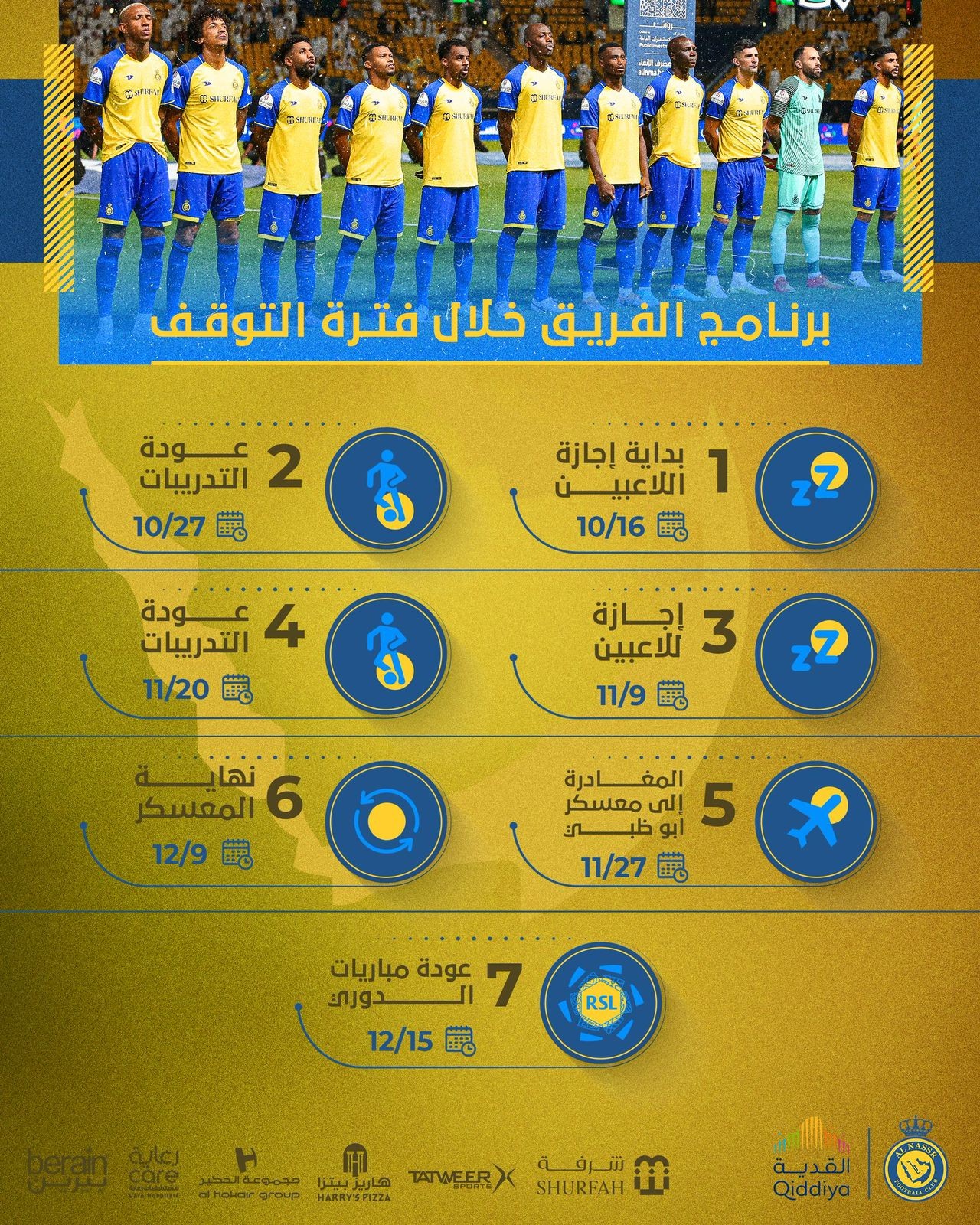 نشر حساب نادي النصر على موقع التواصل الإجتماعي"تويتر" عن خطة النادي خلال التوقف الحالي لمنافسة دوري روشن حيث تقرر أن يكون هناك فترين راحة للاعبين  الفترة الأولى من السادس عشر حتى  السابع والعشرين من الشهر الجاري والفترة الثانية التاسع من نوفمبر حتى العشرين من الشهر ذاته  ، ومن ثم سوف يغادر الفريق إلى معسكر أبو ظبي في السابع والعشرين من نوفمبر ويستمر المعسكر حتى التاسع من ديسمبر قبل العودة إلى الرياض استعداداً لإستئناف الدوري الذي تقرر أن يكون بدايته يوم الخامس عشر من ديسمبر