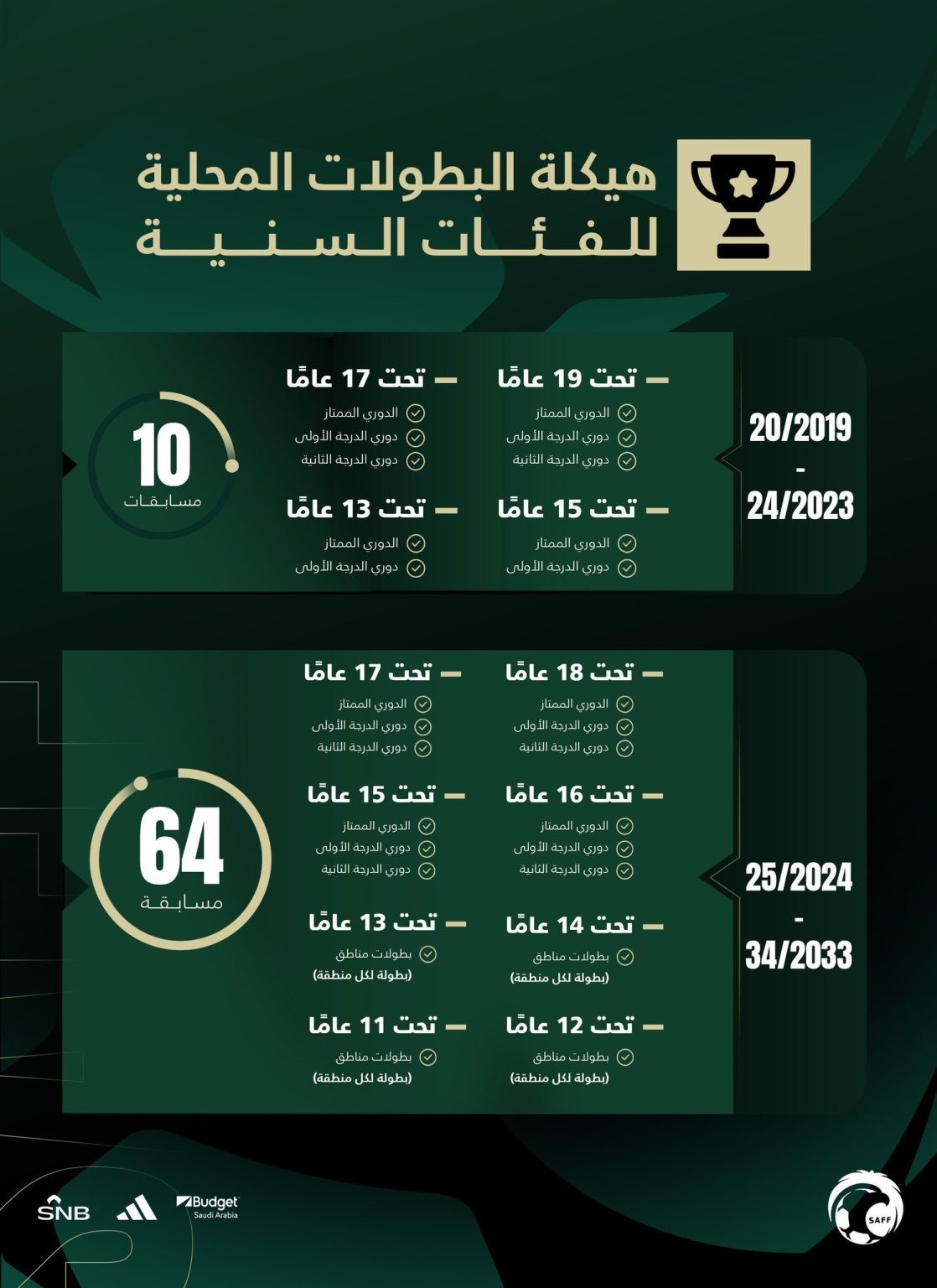 وجاءت زيادة بطولات الفئات السنية ضمن مسار المسابقات في إستراتيجية تحول كرة القدم السعودية التي تم إطلاقها عام 2021، وذلك بهدف تعزيز انتشار المسابقات التنافسية، وضمان مشاركة مختلف الفئات العمرية .