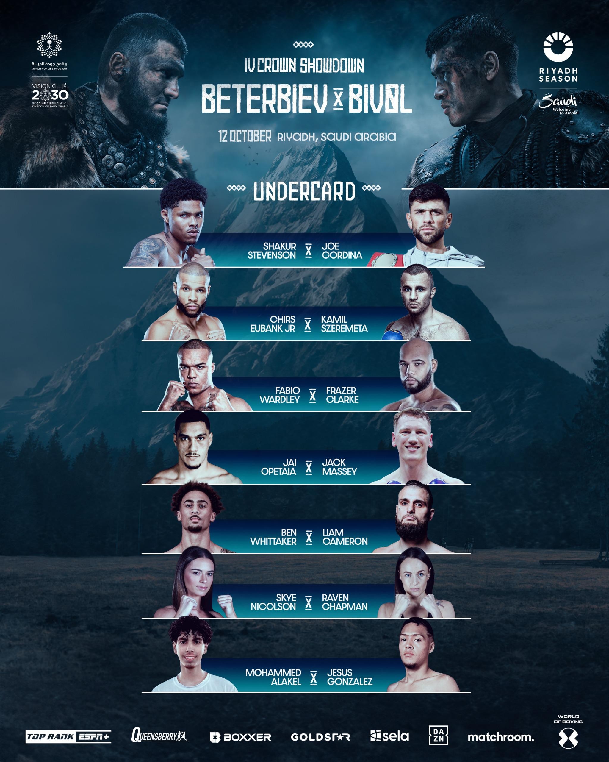 وسيشهد الحدث سلسلة من النزالات المثيرة التي تضم نخبة من الأبطال العالميين في مختلف الأوزان. في وزن السوبر فيذر (وزن الريشة الممتاز)، سيواجه الأمريكي شاكور ستيفنسون مع الويلزي جو كوردينا. وفي وزن المتوسط، يتحدى البريطاني كريس يوبانك جونيور صاحب الـ 18 ضربة قاضية، البولندي كاميل سزيريميتا، في مواجهة تعد بالكثير من الإثارة.