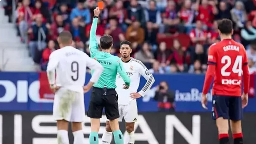 تعرض جود بيلينجهام نجم فريق ريال مدريد، إلى الطرد خلال مباراة فريقه الجارية الآن ضد أوساسونا في مسابقة الدوري الإسباني الممتاز.