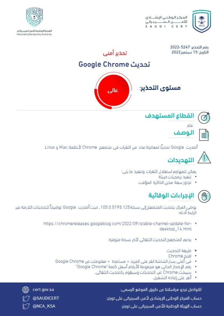 أصدر المركز الوطني للأمن السيبراني ، تحذير أمنى عالي التحديثات جوجل كروم.